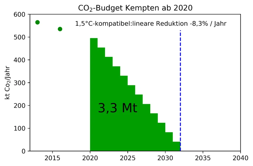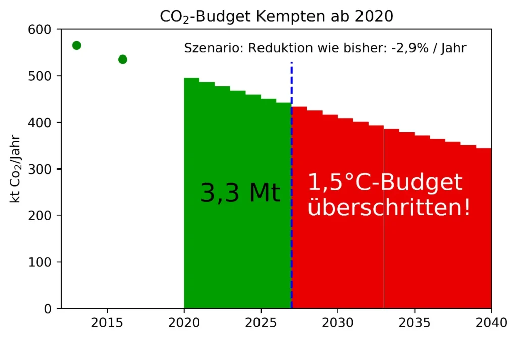 Gemäß der Klimakonferenz von Paris müssen wir die Erderhitzung auf maximal 1,5 Grad begrenzen. Dabei muss klar sein: bereits bei einer Erwärmung um 1,5 Grad treten massive Folgen für Klima und Umwelt ein. Damit geraten zunehmend unsere Lebensgrundlagen in Gefahr. (Siehe auch unseren Beitrag zur FFF-Klimademo.) Die Stadt Kempten überschreitet aktuell das Budget, das ihr noch zusteht, um ein Vielfaches: Um die Klimaziele von Paris zu erreichen, müsste Kempten den CO2-Ausstoß um ca. 8% pro Jahr reduzieren. Aktuell liegen wir bei einer Minderung von nur 2,9%. „Wenn wir von einer Minderung wie bisher ausgehen, dann ist unser Budget in sieben Jahren aufgebraucht, und ab dem achten Jahr nehmen wir, was uns nicht zusteht.“ machte Timo Körber klar.
