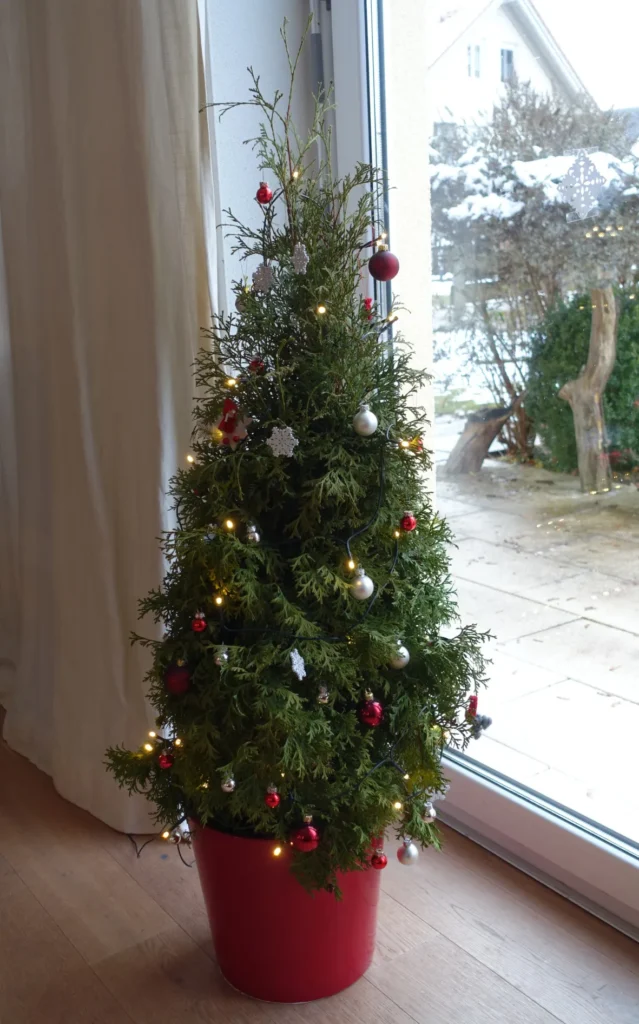 Unsere Familie hat einen ganz besonderen „Weihnachtsbaum“. Genau genommen ist es gar kein Baum, sondern eine Thujahecken-Upcycling-Mogelpackung. Und das kam so: Vor vielen Jahren hatte sich bei uns die Tradition etabliert, einen „Adventsbaum“ aufzustellen. Anfang Dezember kaufte ich bei einem Kemptener Baumarkt immer ein Bäumchen im Topf und wir erfreuten uns die gesamte „stade Zeit“ an dieser duftenden Deko. Bis zu dem Tag vor drei Jahren, als mir bewusst wurde, dass die Bäumchen 1. gar keine oder nur verstümmelte Wurzeln hatten und deshalb nie überlebten, und 2. irgendwo in Rumänien unter (ökologisch und sozial) fragwürdigen Bedingungen produziert wurden und eine weite Reise hinter sich hatten. Gar nicht gut, befand ich, und beschloss, das nicht mehr zu unterstützen.