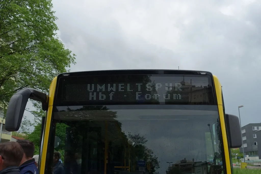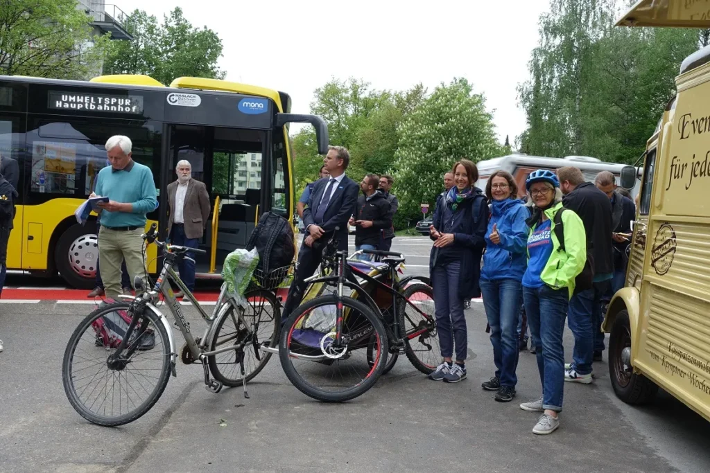 Teilen, teilen, das macht Spaß: Am 13.5.2022 wurden die neuen Umweltspuren in der Bahnhofstraße eröffnet. Der Verkehrsraum wurde hier neu verteilt – ein Novum in der „Autostadt“ Kempten! Aus zwei Spuren für Autos, LKW, Busse etc. (jeweils stadtein- und stadtauswärts) wurde eine für den MIV* plus eine „Umweltspur“. Das ist ein Sonderfahrstreifen für Busse, der auch für Radfahrer freigegeben ist. Autos dürfen die Umweltspur nicht benutzen. Ganz schön mutig von der Stadt – und die erste größere Maßnahme aus dem Mobilitätskonzept, die den Autofahrern etwas „zumutet“ bzw. Platz wegnimmt und anderen Verkehrsteilnehmern zuschlägt.