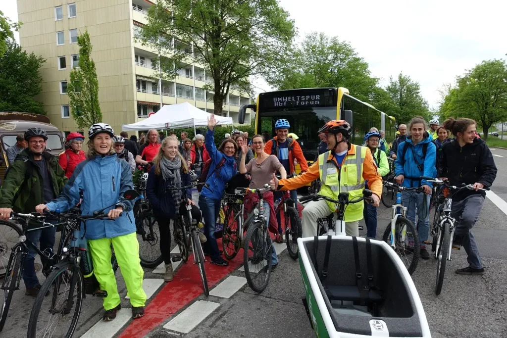 Bei der Eröffnung mit Tiefbauamtsleiter Markus Wiedemann und Kemptens 2. Bürgermeitser Klaus Knoll waren wir „Freundeskreisler“ natürlich dabei. Prima, dass die Hochschule jetzt endlich mit dem Rad zu erreichen ist! Die Jungfernfahrt zeigte zwar, dass die Verkehrsführung für Radler im Detail noch nicht ganz ausgefeilt ist – das Linksabbiegen ist zum Beispiel schwierig bis unmöglich, aber im Großen und Ganzen funktioniert die Umweltspur ganz gut. Eine Verbesserung gegenüber vorher (gar kein Radweg) bedeutet sie allemal!