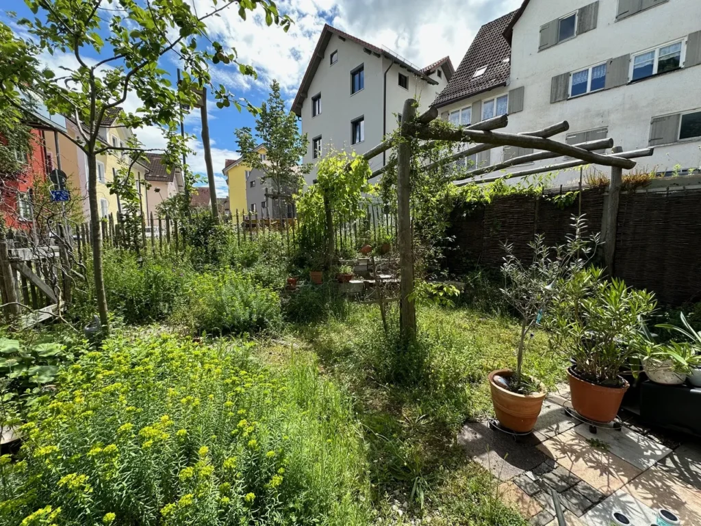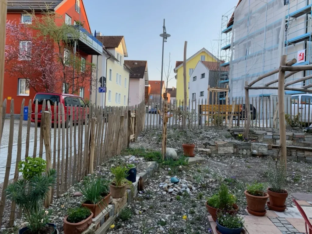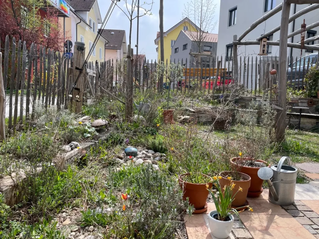 Grün rundum und auf allen Ebenen: Spalier, Dach des Wintergartens, Rankgerüst, teilweise Fassadenbegrünung und Kleingarten bieten reichlich Nahrung für Insekten und ruhige Gartenecken für alle Bewohner*innen. Die Beerensträucher außerhalb der Umzäunung laden ein, sich an der „essbaren Stadt“ zu erfreuen. Unser Garten wurde im Frühling 2020 angelegt – viel Kies und wenig Humus – und entwickelt sich seither „in alle Richtungen“, mit wenig Pflegeaufwand, weitgehend nach seinen eigenen Regeln und mit vielen summenden und blühenden Überraschungen.