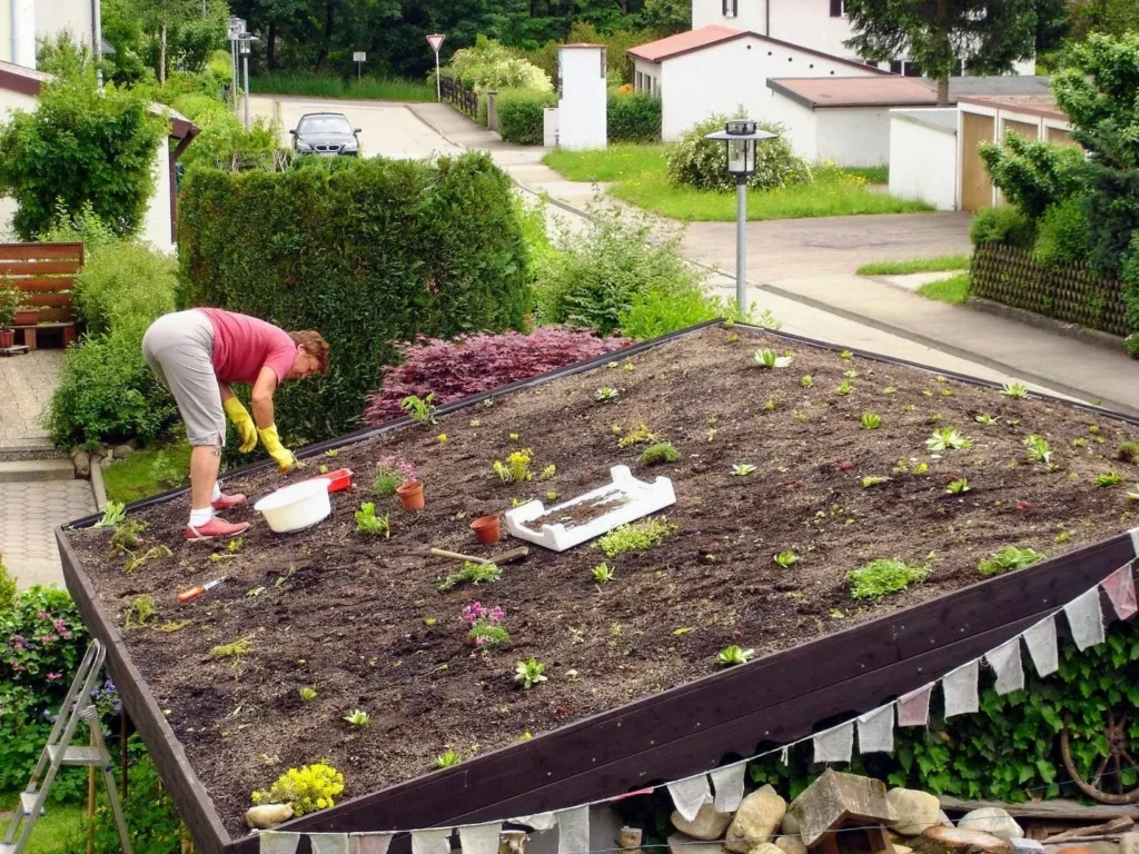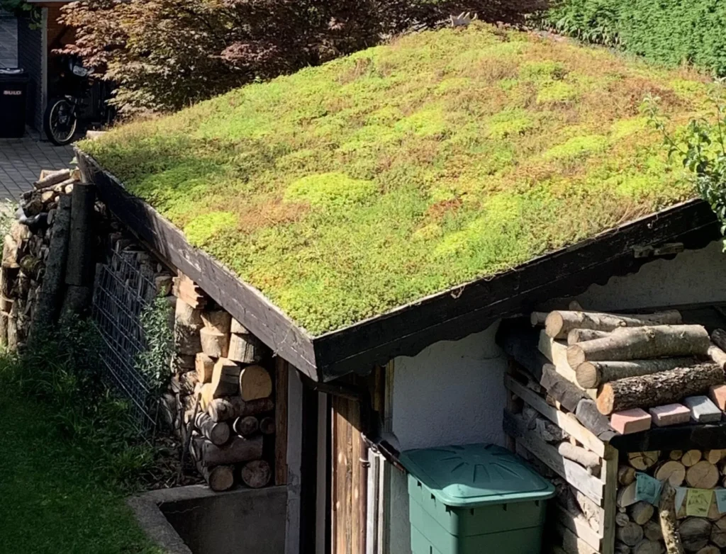 Herzstück des Grasdaches sind Drainagematten, die sehr viel Wasser speichern, das sonst nutzlos in die Kanalisation ginge. Die Regenrinne wurde integriert und mit Lochblechen abgedeckt, so dass überschüssiges Wasser immer gut in die große Regentonne abfließen kann. Auf die Matten kam ein Substrat, das mit einer Sprossensaat extensiv begrünt wurde. Vor allem mit niedrig wachsenden Sedum-Arten, die auch längere Trockenzeiten überstehen können wie Mauerpfeffer, Rotes Laub, Herbstfreunde, Dachwurz, Schillergras und Schafschwingel. Der Pflegeaufwand ist somit praktisch null.
