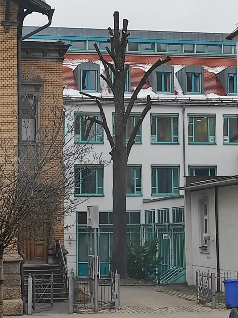 Es ist zum Verzweifeln: seit November 2021 hat Kempten eine Baumschutzverordnung, aber dennoch werden immer wieder (private) Bäume zuschande geschnitten oder illegal gefällt. Zuletzt wurde eine schöne alte Linde in der Beethovenstraße radikal gekappt. Der Baum sieht furchtbar aus – sämtliche Feinäste wurden abgesägt, das heißt, der Baum kann praktisch keine Blätter mehr bilden. Die Linde wird sich durch Not-Triebe wohl noch einige Zeit „über Wasser halten“, doch letztlich bedeutet der unsachgemäße Schnitt ein Tod auf Raten.