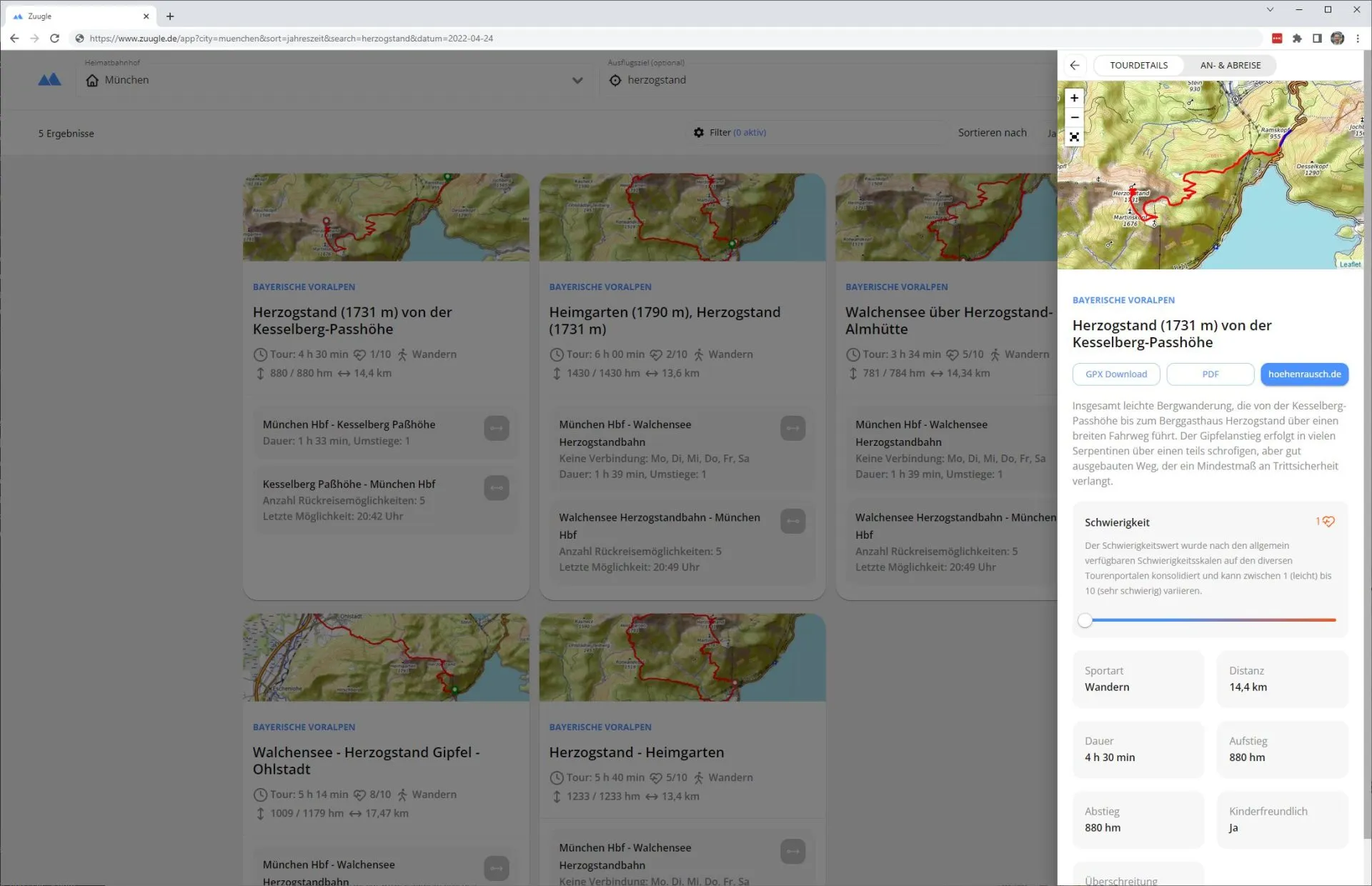 Viele der Touren haben die Berg- und Öffifreunde des Vereins Bahn zum Berg selbst recherchiert (besonders in Österreich, wo der Verein seinen Ursprung hat), andere verweisen auf Portale wie bergfex.de, höhenrausch.de, gamssteig.de usw. Das Geniale daran: die Zugverbindungen für die An- und Abreise bekommt man gleich mitgeliefert! Filtern kann man bei der Suche auch, z.B. nach Höhenmetern oder Anreisezeit, Wandergebiet, Schwierigkeitsgrad, Ein- oder Mehrtagestour… Insgesamt finde ich die Seite optisch sehr ansprechend, übersichtlich und bedienfreundlich.