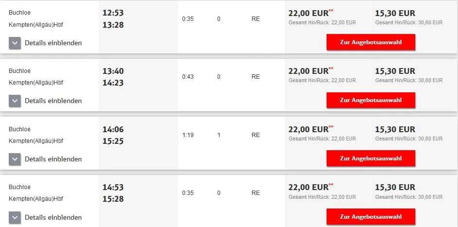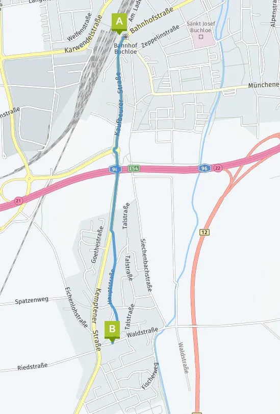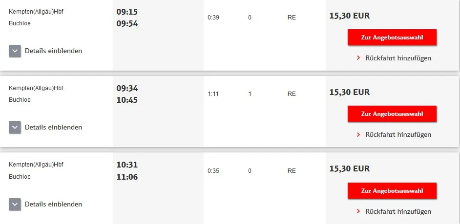 Übrigens gibt es Zugverbindungen von Kempten nach Buchloe, man kann also das Rad in den Zug packen und einen Sonntagsausflug daraus machen. Leider sind die Ankunftszeiten nicht ganz optimal (s.u.). Vom Bahnhof Buchloe zum Gennachstadion in der Waldstraße 40 in Lindenberg sind es laut Falk-Routenplaner ca. 8 Minuten mit dem Rad (s.u.).