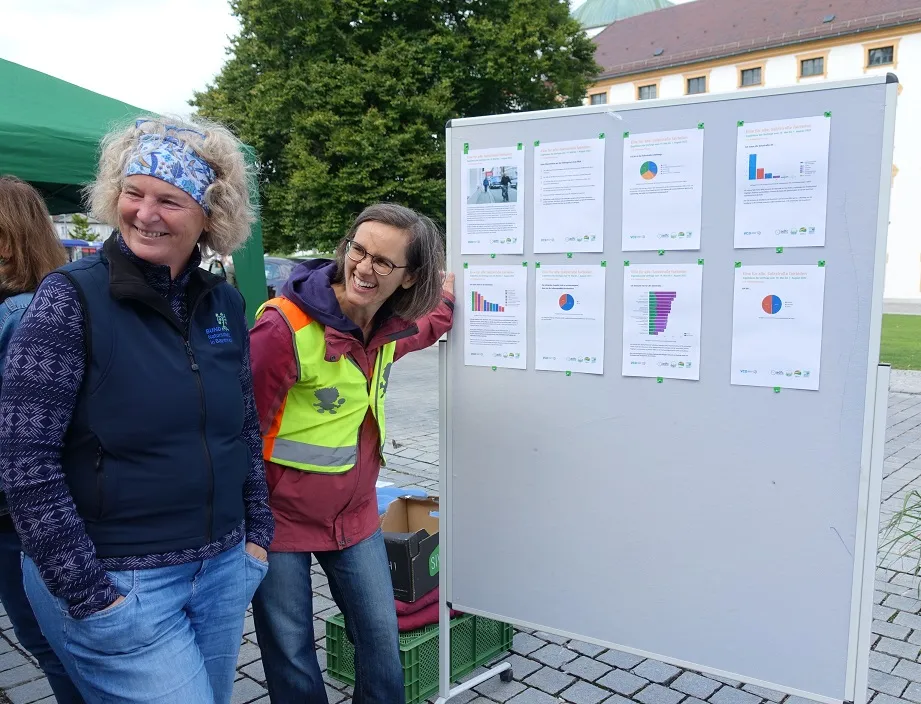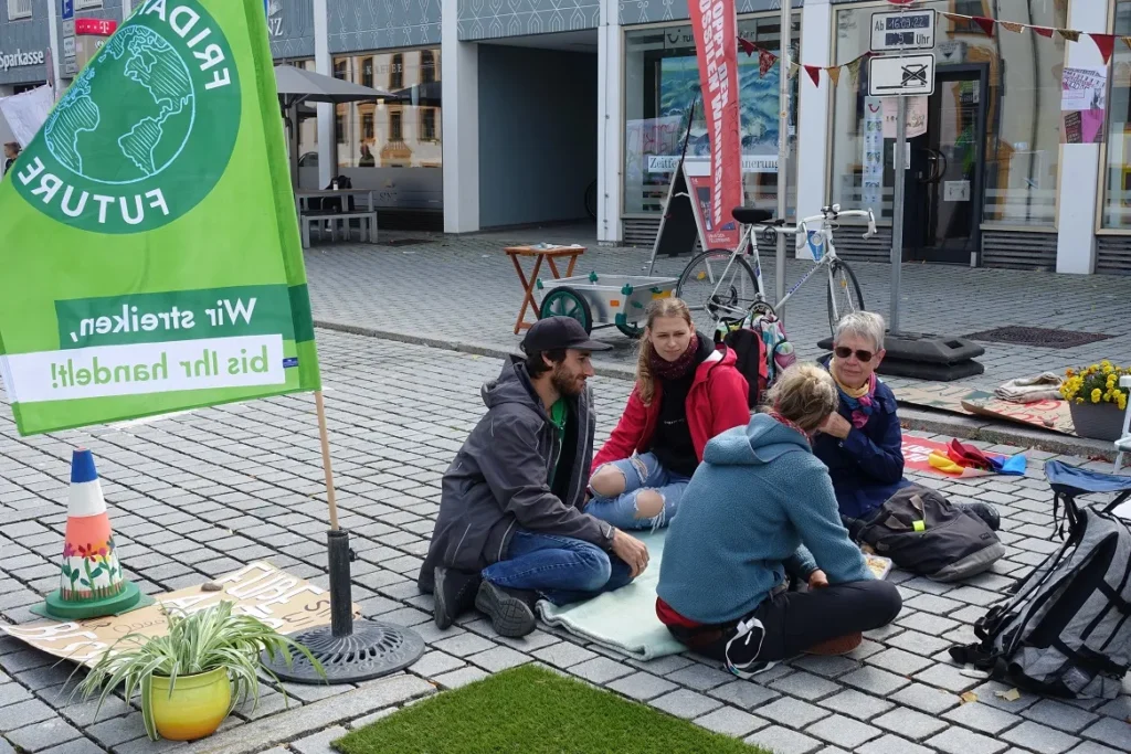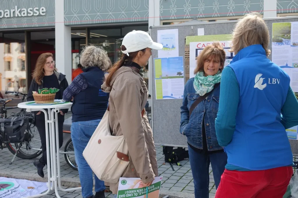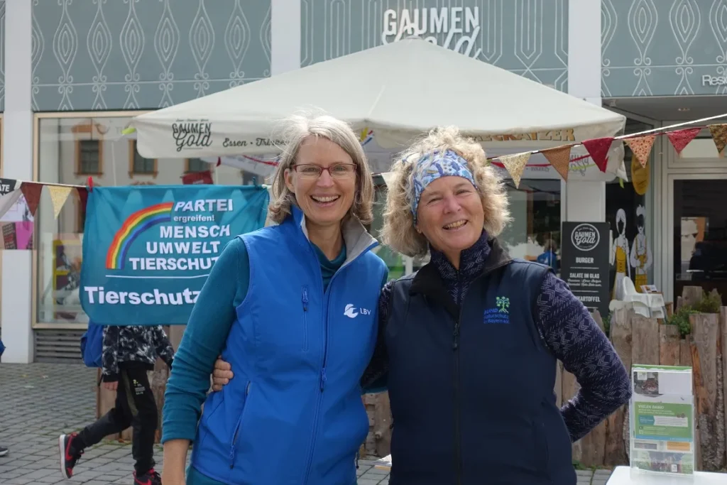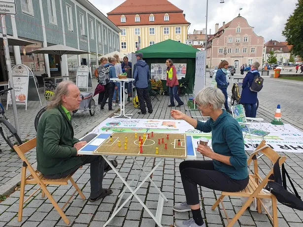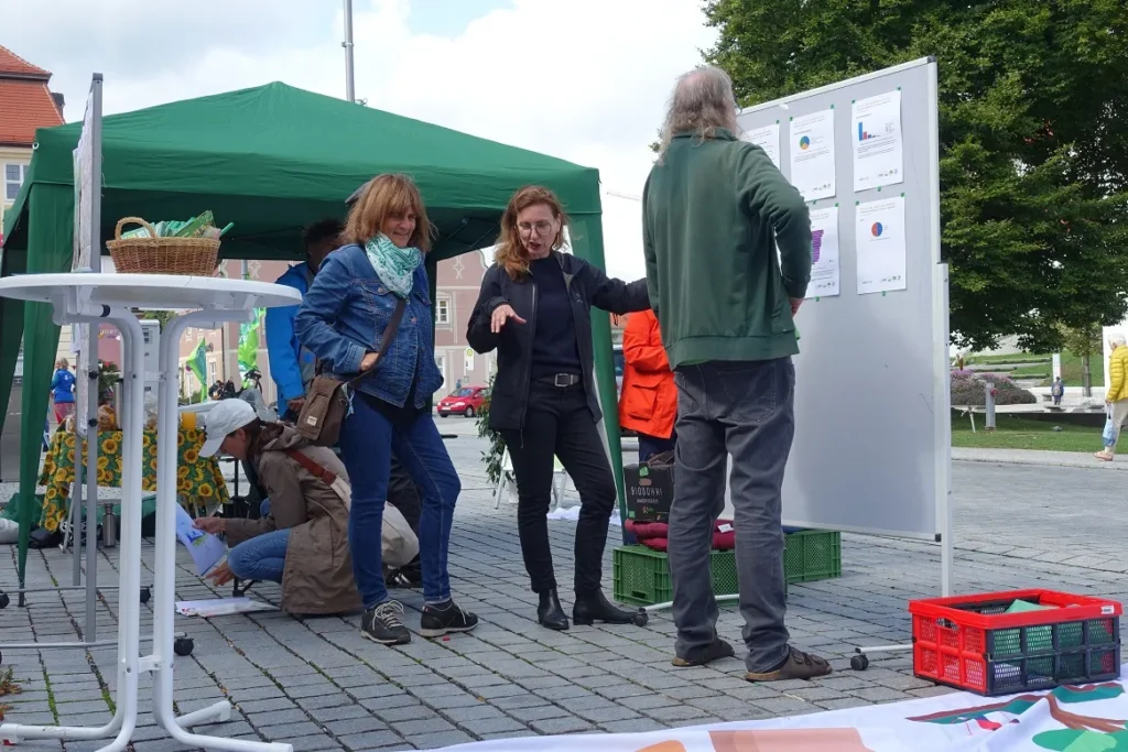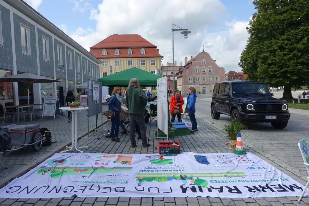 Unter dem Motto „Parks statt Parkplätze, Blumen statt Blech“ verwandelten wir – wie jedes Jahr seit 2019 – die Parkplätze am Residenzplatz wieder in bunte Freizeitoasen. Ziel des internationalen Aktionstages ist es, auf den enormen Flächenverbrauch durch Autos aufmerksam zu machen und für nachhaltige Mobilität zu werben. Leider verwöhnte uns der Wettergott dieses Mal nicht so wie in den letzten Jahren: kaum hatten wir unsere Park-Plätze bezogen, mussten wir uns erst einmal vor einem Regenguss unter den Pavillon der Grünen retten!