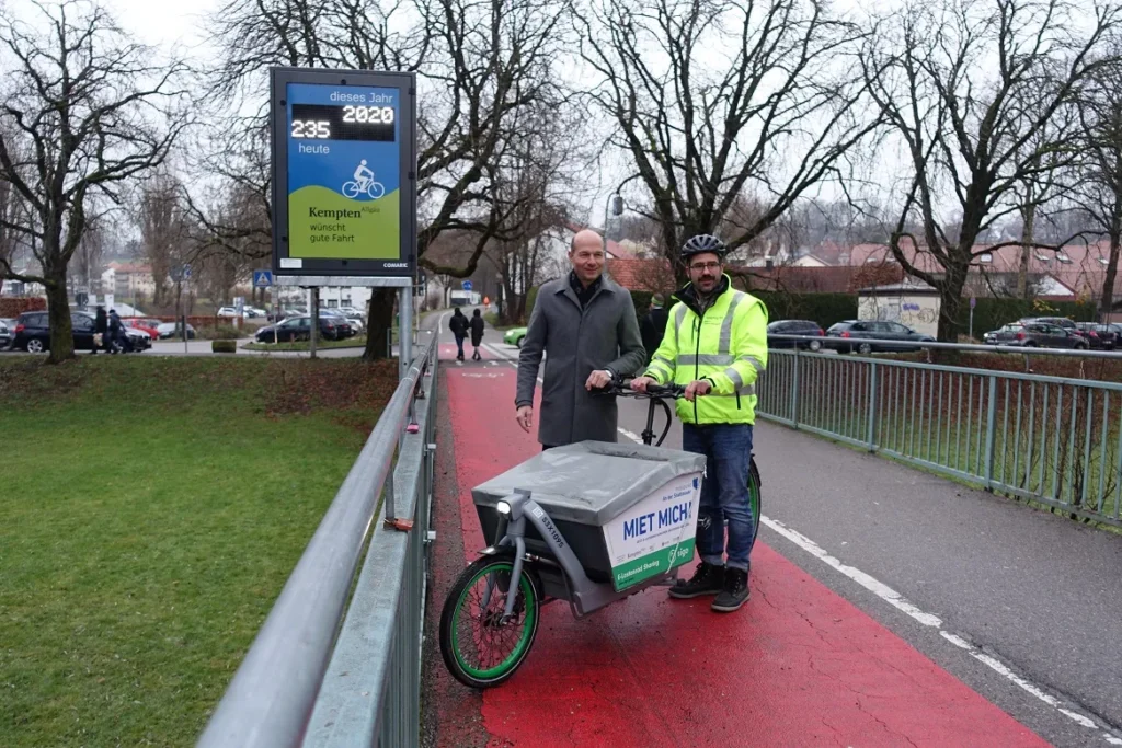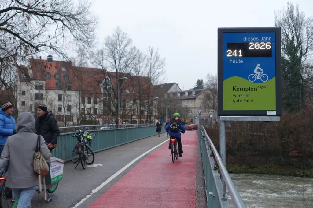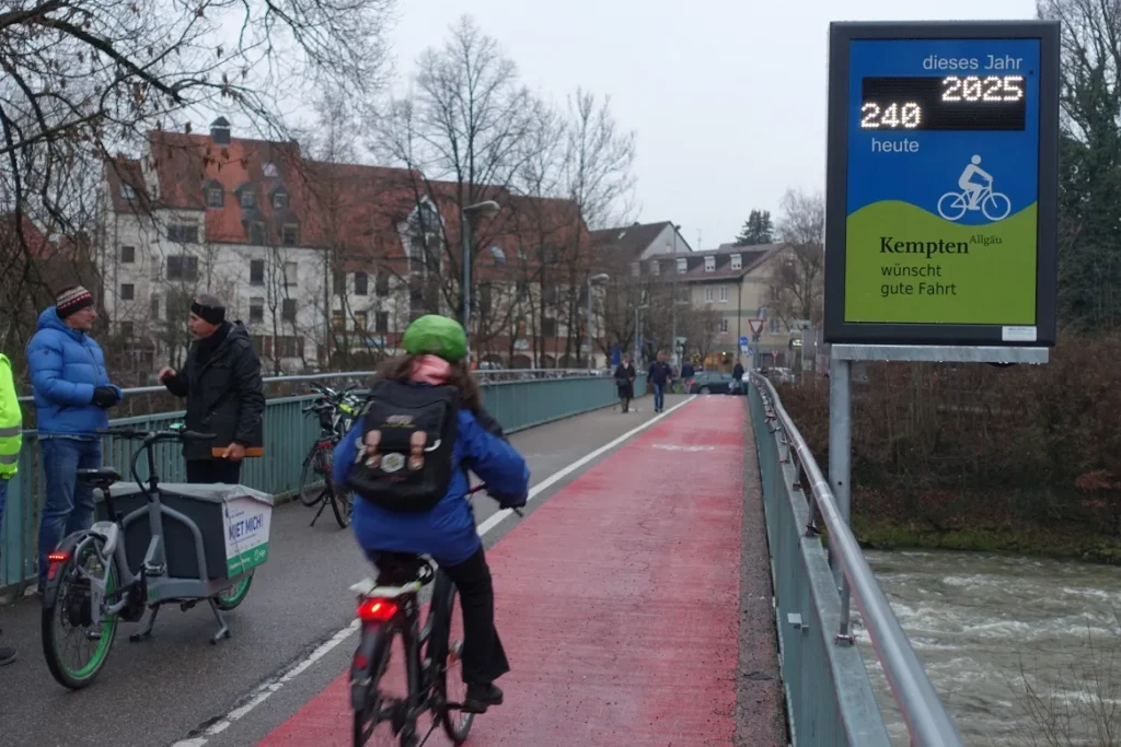 Sogar Oberbürgermeister Kiechle gab sich die Ehre: am 15.12.2022 wurde die erste Radverkehrs-Zählanlage Kemptens eingeweiht. Am Illersteg (Jahnbrücke), einer wichtigen Verbindung in die östlichen Stadtteile, zeigt nun ein Display an, wie viele Radler vorbeigefahren sind. So will die Stadt Kempten überprüfen, wie sich der Fuß- und Radverkehr in Kempten entwickelt – ob er abnimmt, stagniert oder zunimmt. Außerdem sollen die Menschen dadurch motiviert werden, mehr Rad zu fahren. Fußgänger werden ebenfalls erfasst, aber nicht auf dem Display angezeigt.
