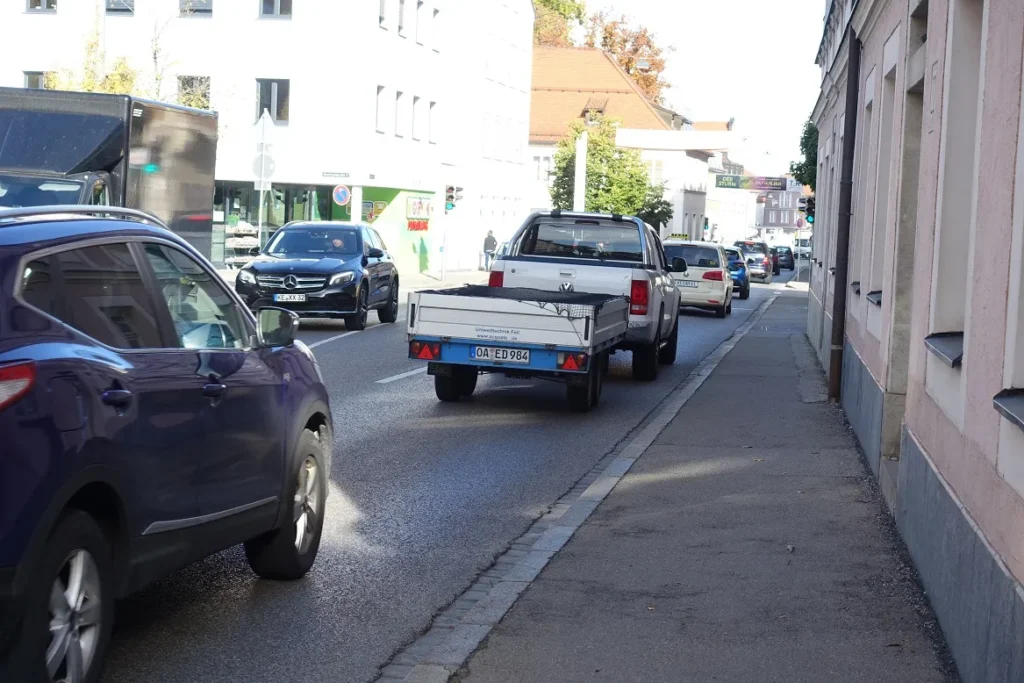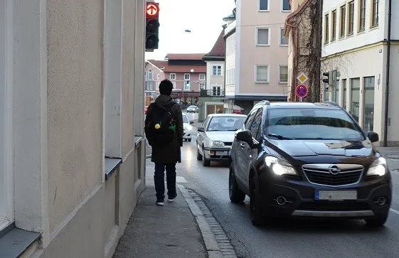 Täglich rollt eine Blechlawine auf dieser Nord-Süd-Verbindung quer durch Kempten. Die stark befahrene Salzstraße zerschneidet die historische Innenstadt – Raum für Fußgänger oder Fahrradfahrer bietet sie kaum. Besonders eng geht es zwischen Eberhardstraße und Wartenseestraße zu. Ein Bürgersteig ist zwar vorhanden, doch dieser ist zum Teil extrem schmal und nicht nur für Menschen mit Rollator oder Kinderwagen eine Zumutung. Kinder und Jugendliche queren pulkweise die Salzstraße, um von der ZUM zur Schule zu gelangen. Radfahrer müssen im Mischverkehr zwischen den Autos fahren. Kurzum: die von Autos dominierte Salzstraße ist für Radfahrer, Fußgänger und Anwohner ein unwirtlicher Ort. Mit dem Rad durch die Salzstraße, das bedeutet Adrenalin pur: Autos, die bei Rot über die Ampel fahren, riskante Überholmanöver, Fußgänger, die auf die Fahrbahn treten … – hier geht’s zum Video „Szenen aus der Salzstraße“ (Dauer: ca. eine Minute).