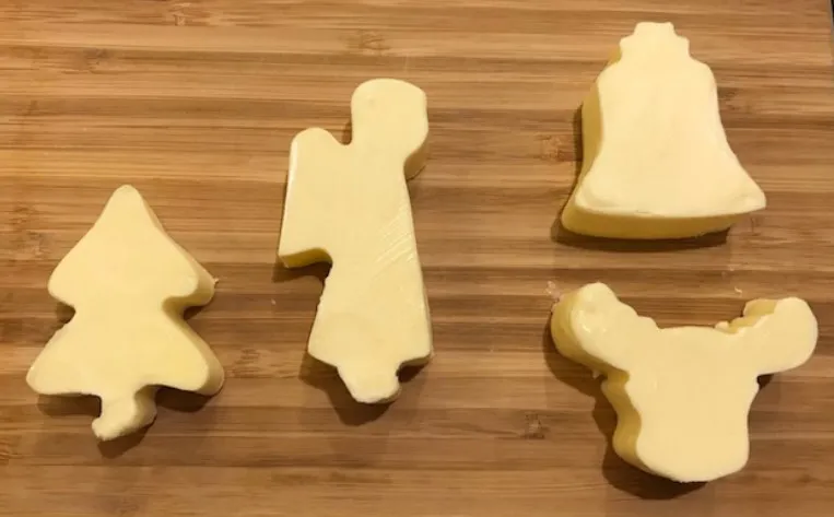 Man nehme ein Stück gute regionale Allgäuer (Bio-) Butter und schneide sie mit einem warmen Messer in zwei Scheiben. Aus diesen Scheiben sticht man mit Plätzchenausstechern wunderschöne Weihnachtsmotive aus. So hat man schnell, kostengünstig und verpackungsarm eine tolle Weihnachtsdeko für den Frühstückstisch! Butter an sich ist allerdings nicht gerade ein klimafreundliches Lebensmittel. Für all diejenigen, die ein besonders nachhaltiges Weihnachten feiern möchten: das Ganze funktioniert auch rein pflanzlich mit schnittfester Margarine.