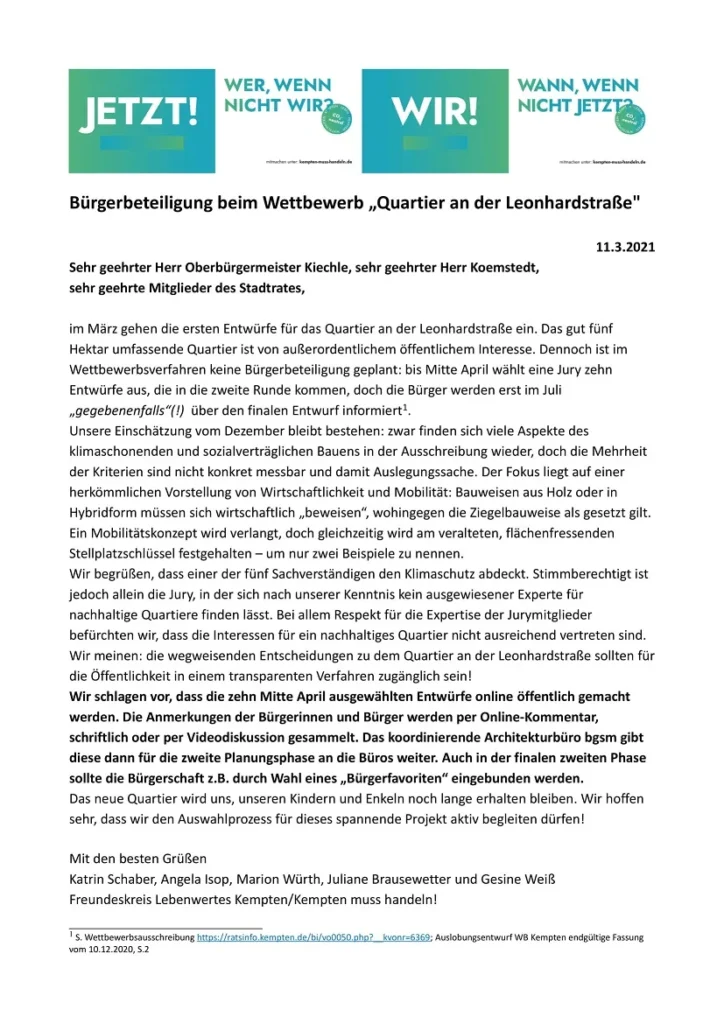 Läuft es wie geplant, dann bekommt die Bürgerschaft erst im Juli den finalen Entwurf präsentiert. Und das laut Ausschreibungstext auch nur „gegebenenfalls“. Schade, dass die Öffentlichkeit bei so einem zentralen Projekt außen vorgelassen wird, fanden wir, und schrieben folgenden Brief: